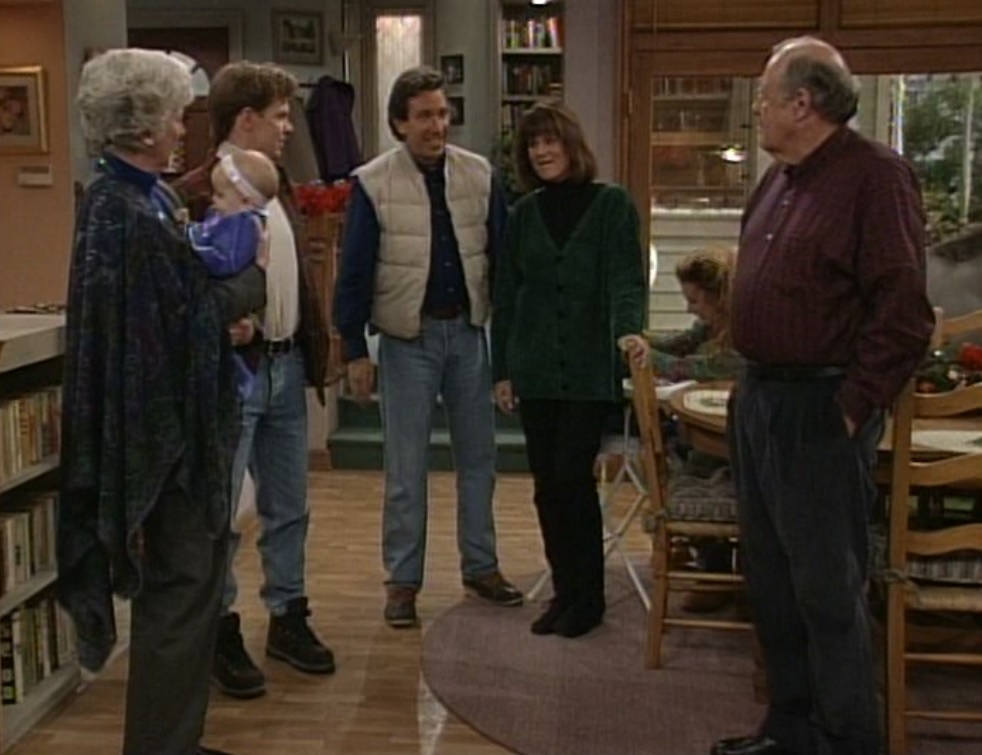 This opening scenes would almost lead viewers to believe this was going to be Home Improvement’s take on Christmas vacation, with one too many visiting family members, people fighting for their spot in the bathroom, Tim trying to escape the chaos by decorating the house. The inclusion of Jill’s parents, Tim’s brother/sister in law and their twin babies might make this the largest guest cast of any Christmas special. There are some amusing scenes involving the twin babies, such as one of the twins legitimately starting to cry as Jill’s Dad pretends to fire her as a machine gun, or Tim attempting to get a live baby for his manger scene. I wish they’d made a note to the season 8 writers that the twins are best used without any lines of dialogue. The main focus though is on Jill’s parents constant bickering since The Colonel retired. This is the perfect setup for Jill unsuccessfully attempting to try out her new Psychology knowledge, which then results in everyone arguing with everyone. Home Improvement’s conflict is usually kept to a minimum. The bickering in this episode is a lot more than Home Improvement usually features, but I see this episode as one that’s embracing a dysfunctional family Christmas. The performances of Oscar nominee M Emmett Walsh and Polly Holiday as Jill’s parents bring a lot to what would otherwise be a typical sitcom story line. In a nice change of pace it’s actually Jill who makes the mistakes in this episode, and of all people Tim turns out to be the hero by motivating his father in law to change his ways. Even with the Colonel acknowledging Tim is “not such an idiot” he still refuses to call him by his name. “It wasn’t you. It was ‘Hey, You'”. While the episode isn’t necessarily as funny as the others from the first 5 or 6 seasons, it offers enough amusing scenes, and great guest stars to give the main cast a change in pace.
